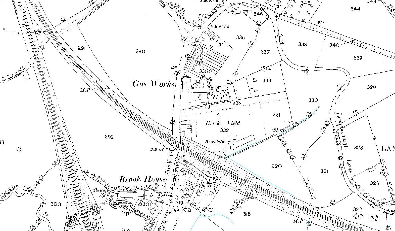 In Oxford road nearly opposite the station there were brickworks in 1870 and 1898, but they appear to have gone by 1910. Thomas Marley Westcott was making bricks here in 1877 and gave the railway station as his address in 1883. This map is from 1871 and shows the brick field.