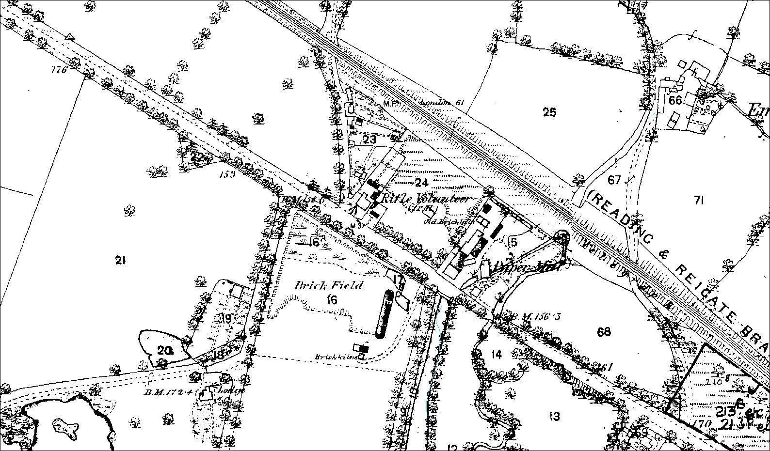 At Emmbrook, opposite the Rifle Volunteer there was a brickfield and kilns in 1870. They were however gone by 1898. This extract showing its location is from an 1872 map. It is on the site currently occupied by the Shell garage.