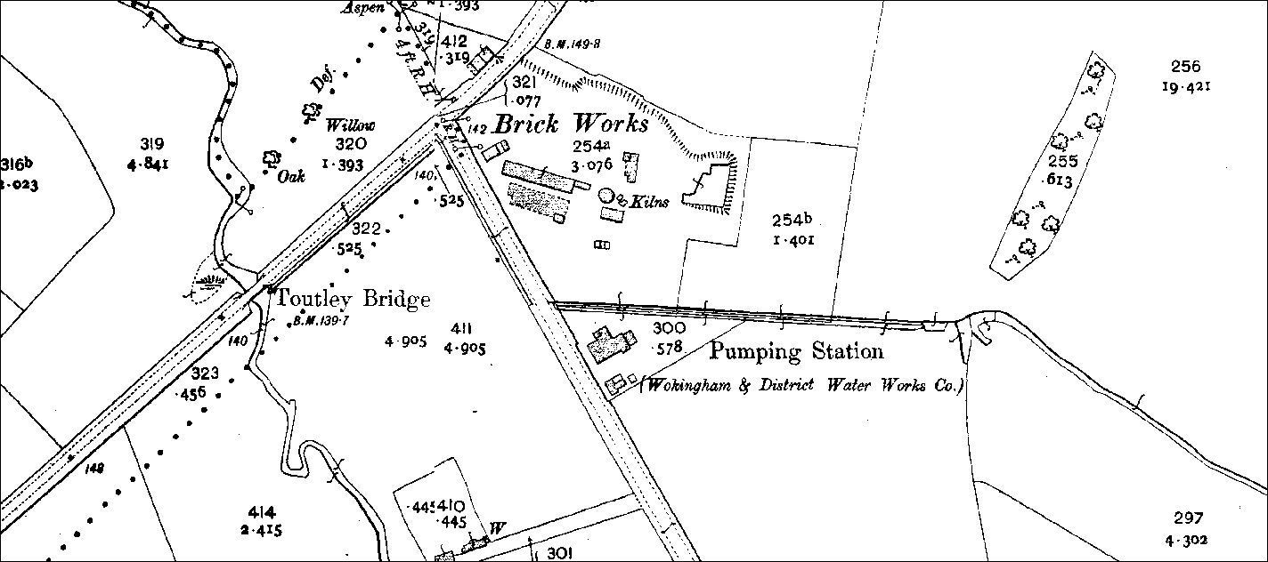 Brickworks were at the junction of Toutley Road and Forest Road in 1898. Edmund W Collis and Company made bricks and tiles here in 1907 and 1915. William Charles James Hissey had taken over by 1920 and was still there in 1931.William Davis was there in 1935. Toutley Brick Works Ltd succeeded, founded in 1936 by the proprietors of Gough’s Lane Brick Works Ltd( Warfield) with Thomas Lawrence &Sons holding 50% of the capital. The works were requisitioned in 1940 for the Static Condenser Company to which they were sold by Lawrence’s after the war.